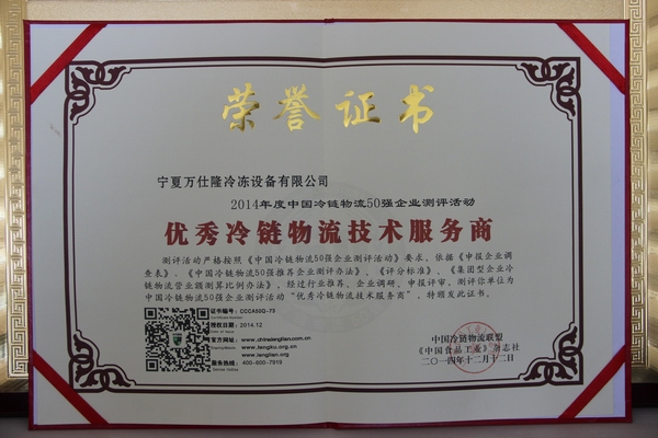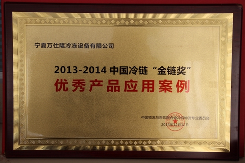 熱烈祝賀萬仕隆冷凍集團(tuán)寧夏公司在第七屆中國冷鏈物流行業(yè)年會中獲得"2013-2014中國冷鏈優(yōu)秀產(chǎn)品應(yīng)用案例金鏈獎"和"優(yōu)秀冷鏈物流技術(shù)服務(wù)商"兩項殊榮!