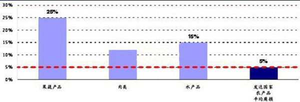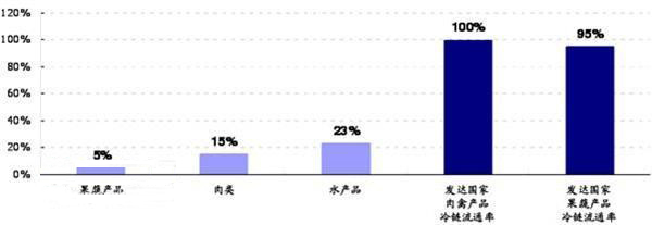損耗率高的原因在于冷鏈物流體系全面落后。冷鏈流通率低使得冷鮮產(chǎn)品腐損率難以得到控制:目前中國(guó)果蔬、肉類、水產(chǎn)品冷鏈流通率分別為5%、15% 和23%,遠(yuǎn)低于歐美發(fā)達(dá)國(guó)家水平,歐美等發(fā)達(dá)國(guó)家的肉禽冷鏈流通率已達(dá)100%,果蔬冷鏈流通率也達(dá)95%以上,而中國(guó)仍有大部分生鮮農(nóng)產(chǎn)品仍在常溫下流通;部分產(chǎn)品雖然在屠宰或儲(chǔ)藏環(huán)節(jié)采用了低溫處理,但在運(yùn)輸、銷售等環(huán)節(jié)又出現(xiàn)“斷鏈”現(xiàn)象,全程冷鏈的比率過低。