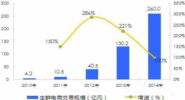 生鮮電商的發(fā)展呈現(xiàn)出爆發(fā)式增長(zhǎng)態(tài)勢(shì),資本造勢(shì)從未停歇。數(shù)據(jù)顯示,2010年,生鮮電商市場(chǎng)交易規(guī)模僅為4.2億元,到2012年增至40.5億元,同比增長(zhǎng)286%;2013年達(dá)到130.2億元,同比增長(zhǎng)221%;2014年,市場(chǎng)交易規(guī)模飆漲至260.0億元。