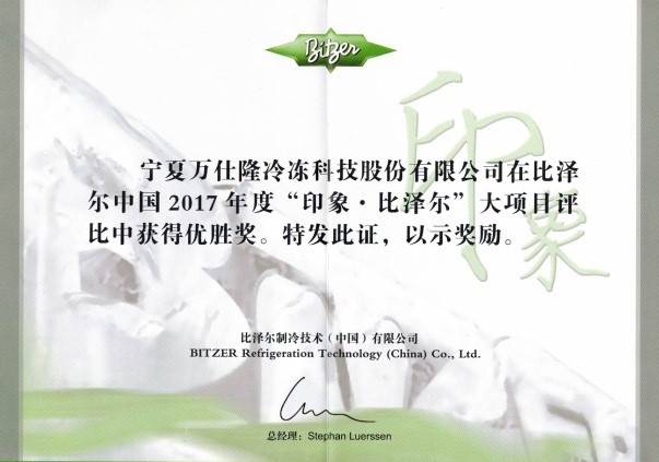 萬(wàn)仕隆冷凍科技在比澤爾中國(guó)“印象?比澤爾”大項(xiàng)目評(píng)比脫穎而出,獲得“印象?比澤爾”大項(xiàng)目?jī)?yōu)勝獎(jiǎng),成為比澤爾第一次大項(xiàng)目評(píng)比活動(dòng)的優(yōu)勝者。