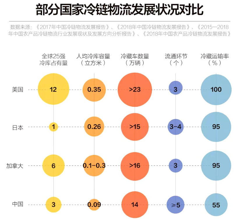 和部分國家比起來,我國人均冷庫容量低、冷藏車數(shù)量少、流通周轉(zhuǎn)環(huán)節(jié)繁瑣且食品折損率高。只有全球25強冷庫這一指標(biāo)優(yōu)于日本,但這也是建立在我國比日本幅員遼闊的前提上。